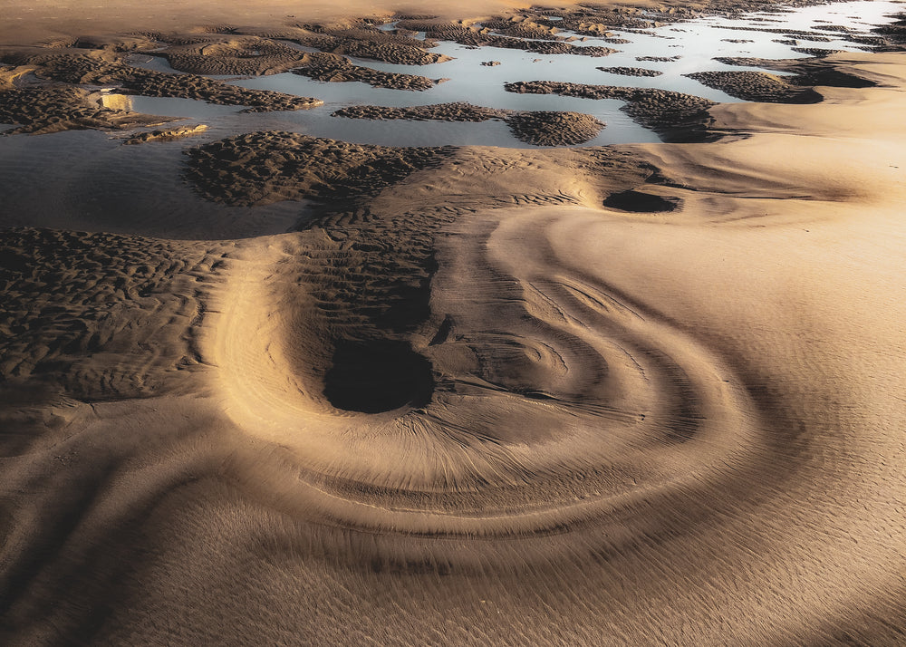 As I ventured over the dunes, the sun cast a shimmer on the gentle waves, revealing an unexpected marvel. The receding high tide had sculpted intricate patterns and tidal pools in the sand, unlike anything I had seen before.